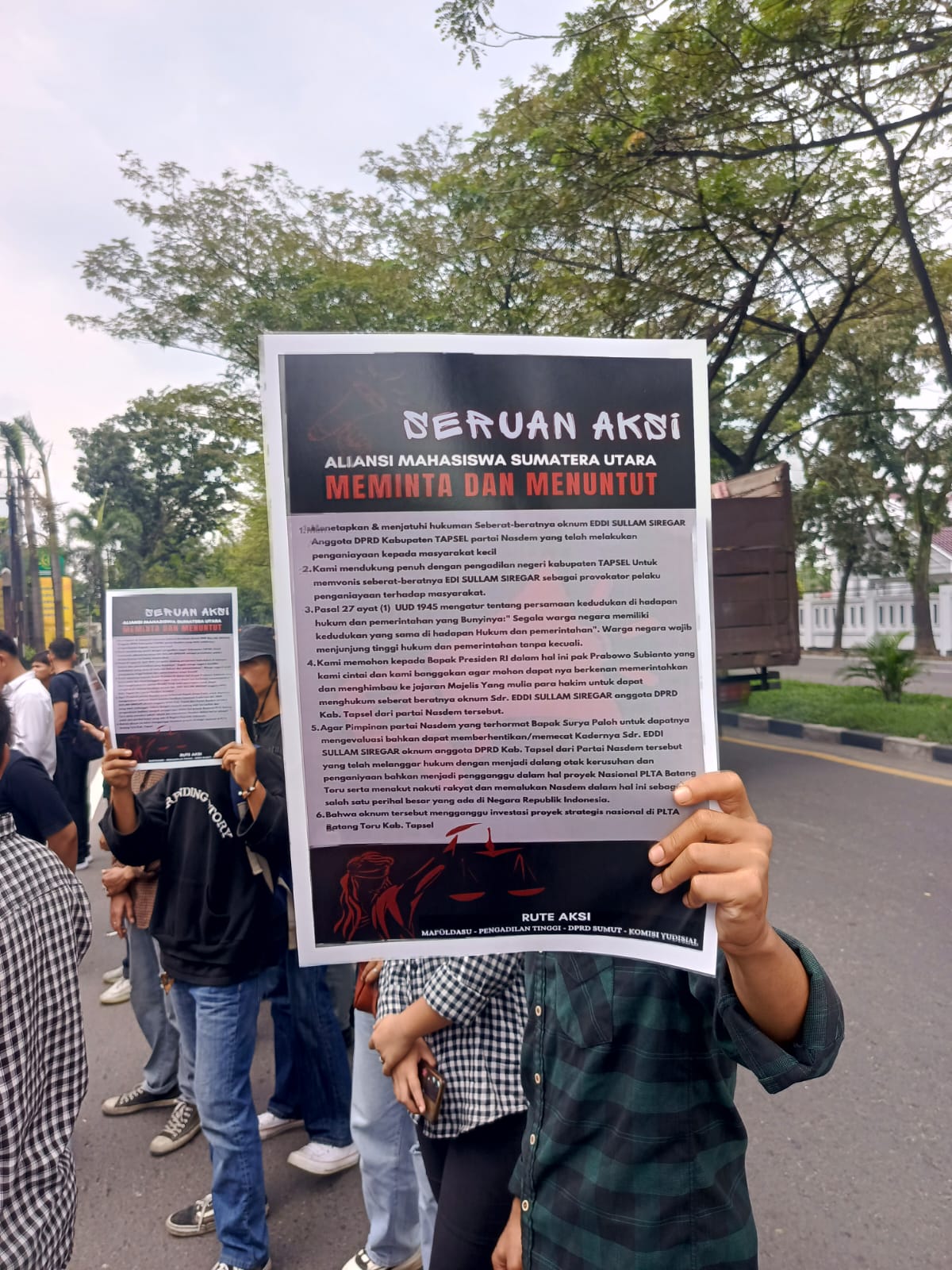 “Yang bersangkutan sudah melanggar hukum dengan melakukan penganiayaan bahkan menjadi penggangu dalam proyek strategis nasional di PLTA Batang Toru dengan menakut-nakuti warga dan mempermalukan Partai Nasdem dengan perbuatannya itu,” tukas massa.