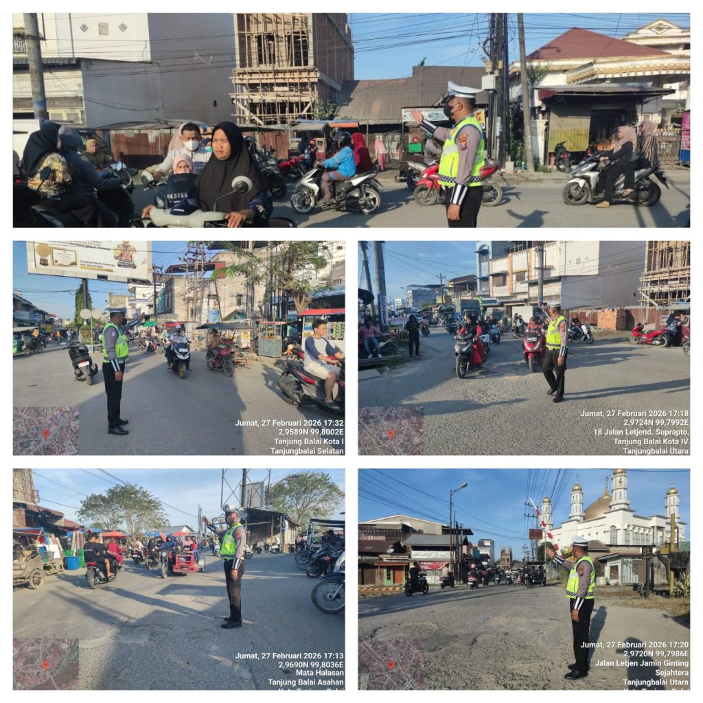 Tanjung Balai | Presisi24jam.com-Memasuki berbuka puasa, suasana sore di Kota Tanjungbalai mulai diramaikan dengan fenomena “Pasar Tumpah”. Demi memastikan warga bisa berburu takjil dengan aman dan nyaman, Polres Tanjungbalai menerjunkan personel untuk melakukan pengamanan dan pengaturan lalu lintas di berbagai titik keramaian pada Jumat