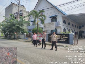 Tanjungbalai | Presisi24jam.com-Dalam rangka pengamanan warga yang melaksanakan ibadah ke Gereja pada Minggu, personel Satlantas Polres Tanjungbalai menggelar kegiatan Pam Jalur Lalu Lintas di sejumlah gereja, Minggu (5/1/2025) sekitar pukul 09.00 Wib.