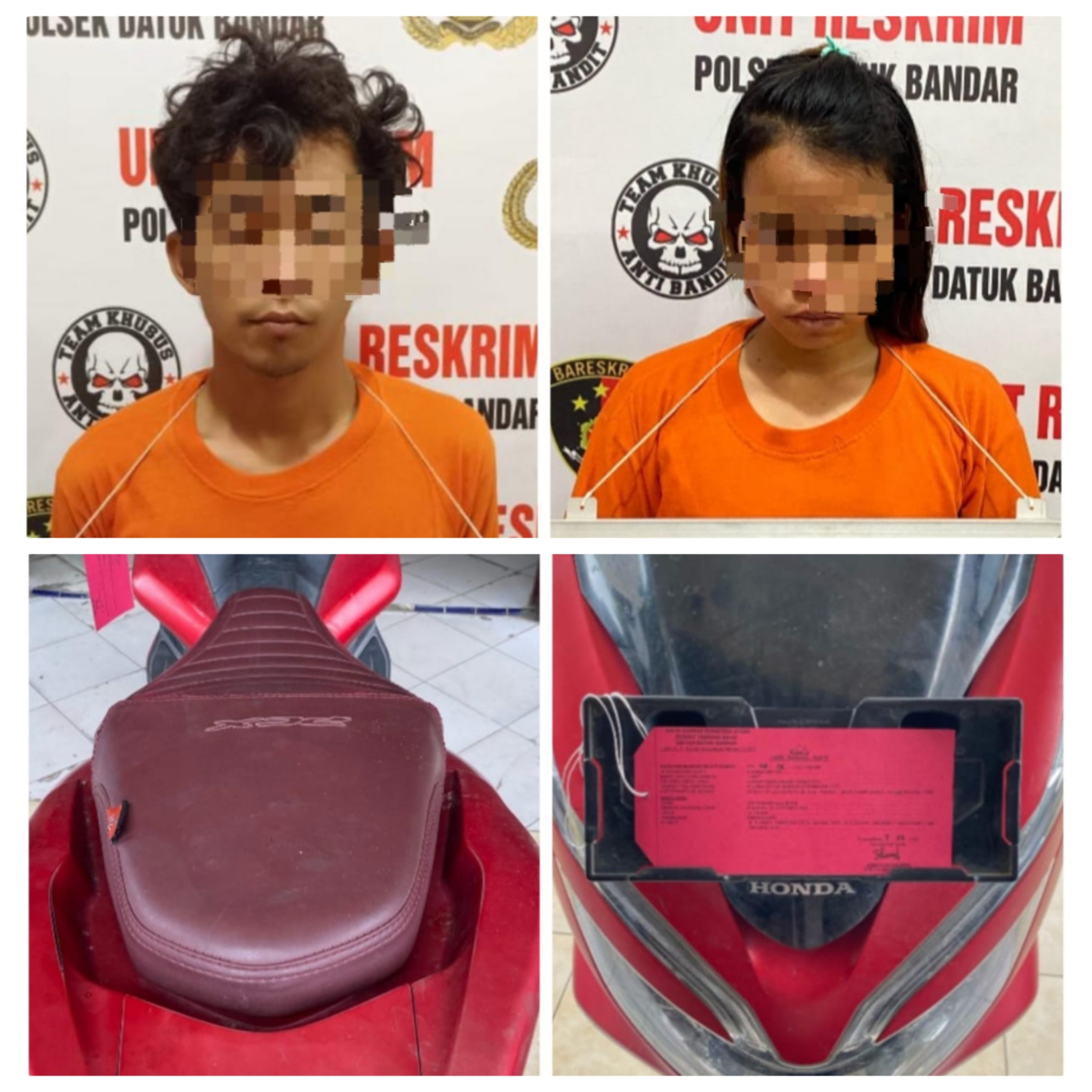 Dari hasil interogasi terhadap tersangka AM mengakui bahwa, pada bulan November 2024 dijalan Jendral Sudirman Kilometer 7 Kelurahan Sijambi Kecamatan Datuk Bandar, AM bersama PN (yang merupakan pasangan kekasih) meminjam 1 unit Sepeda Motor Honda PCX Tahun 2001 warna merah No. Pol BK 6757 QAI Nomor Rangka MH1KF2113KK161397 dan Nomor Mesin KF21E1160910 dari seseorang bernama FML (anak pelapor).